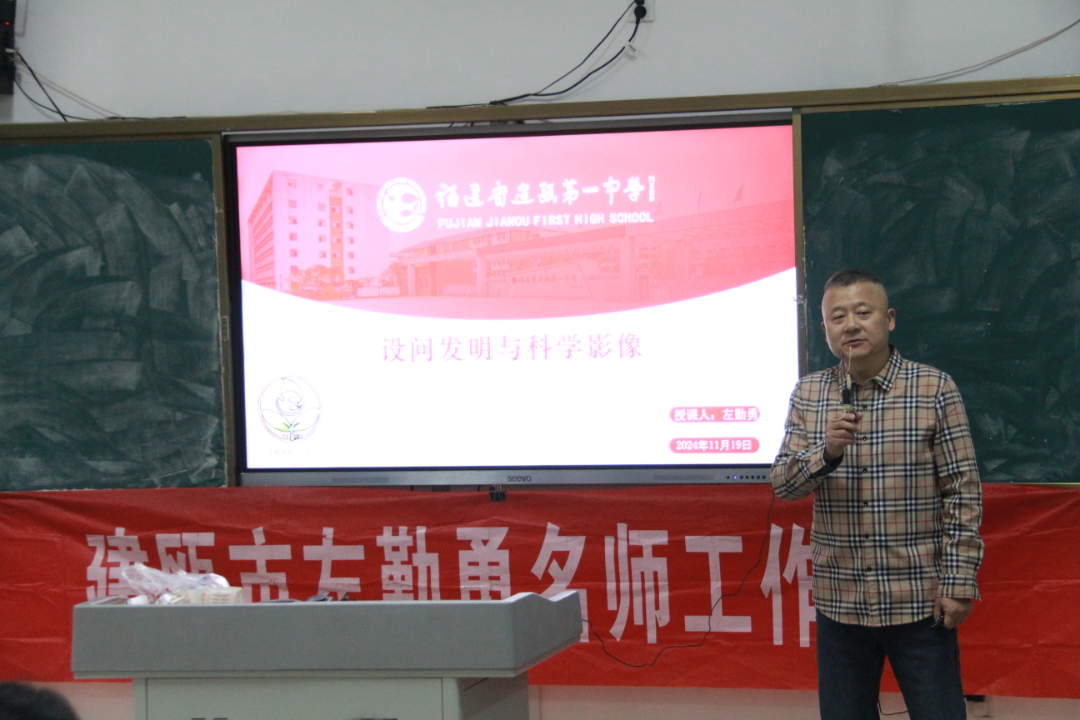 讲座伊始,左勤勇老师以福建省青少年科技创新大赛和科学影像节两项竞赛活动的获奖项目为引子,深入浅出地介绍了创新技法“设问发明法”。